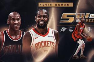 体育资讯3月23日讯 NBA常规赛,火箭123-122力克热火。杜兰特生涯总得分超越乔丹,上升至NBA历史第五。