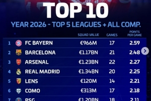 体育资讯3月24日讯 德转盘点了2026年五大联赛球队在各项赛事场均积分榜,其中拜仁居首,具体如下: