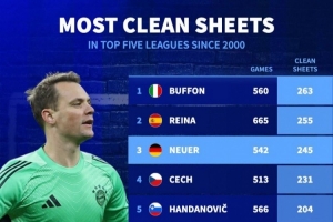 2000年以来五大联赛门将零封榜:布冯263场居首,雷纳、诺伊尔前3