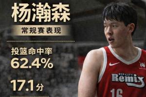 杨瀚森在常规赛出战了14场,投篮命中率62.4%,三分球32.1%,罚球命中率75%,场均17.1分9.2篮板3.1助攻0.7抢断1.6盖帽。