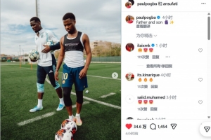 博格巴晒与法蒂在巴萨基地训练照,配文:父与子