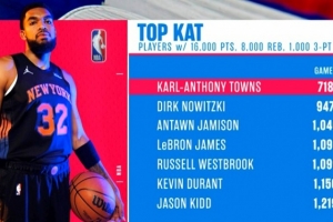 唐斯在生涯第718场达成,比此前用时最短的诺维茨基少了229场!