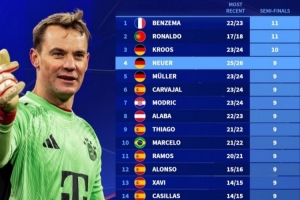 诺伊尔第9次参加欧冠半决赛,并列第4!仅次本泽马、C罗、克罗斯